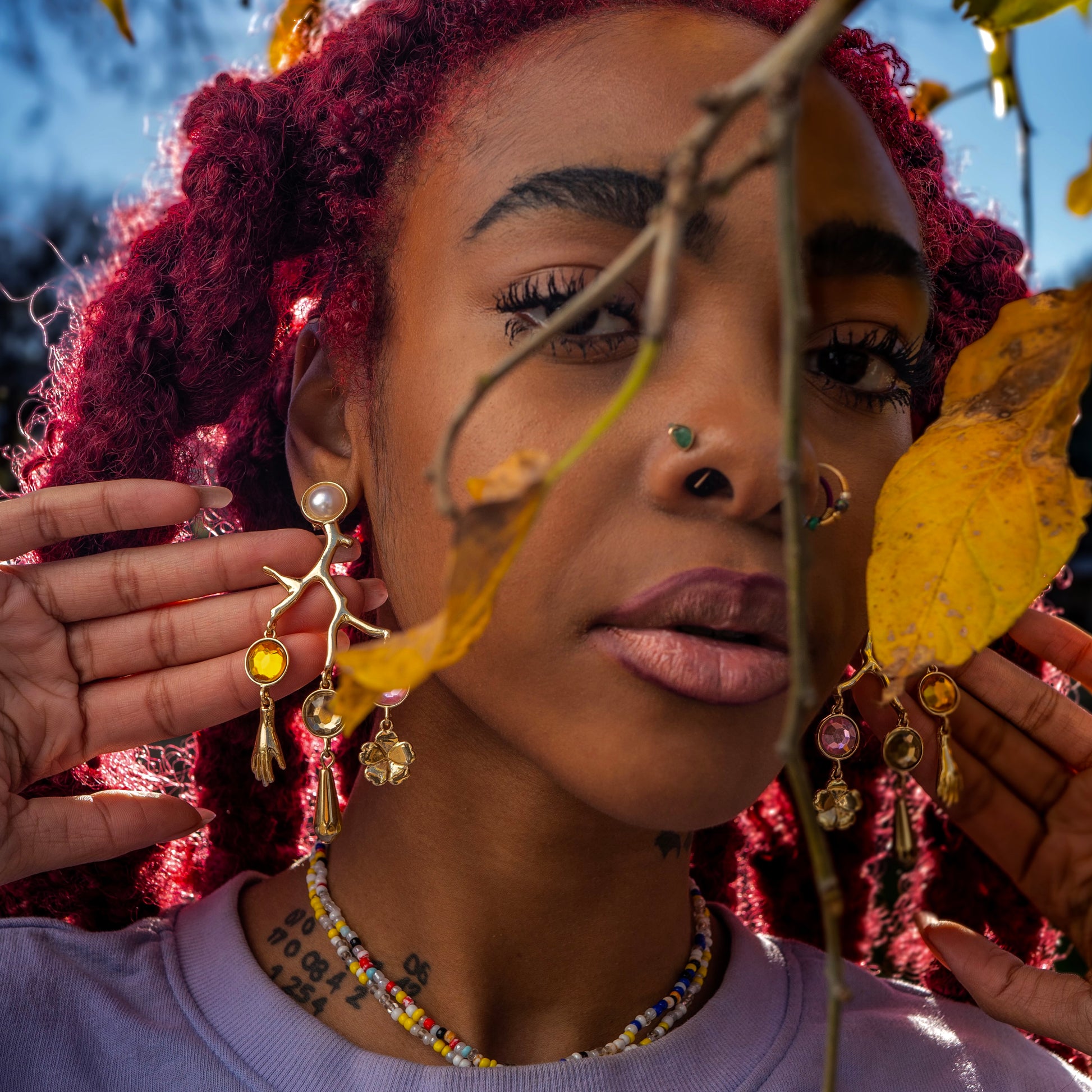 Golden tree branch pearl statement with colorful Diamond decor. Ending with a beautiful hand and good luck flower statement.