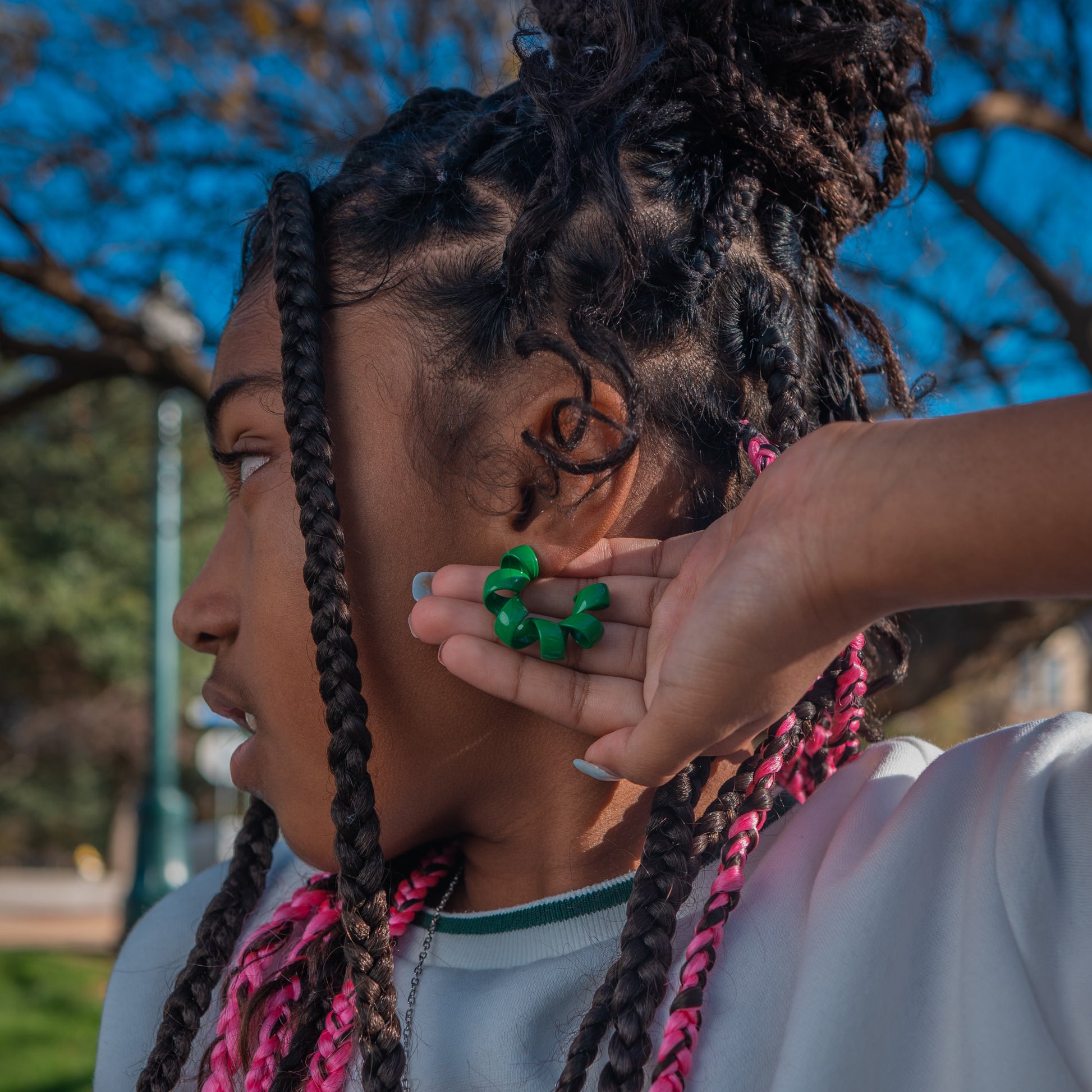 Male and female friendly (kid optional selection of earrings) Dark green spiral hoop.